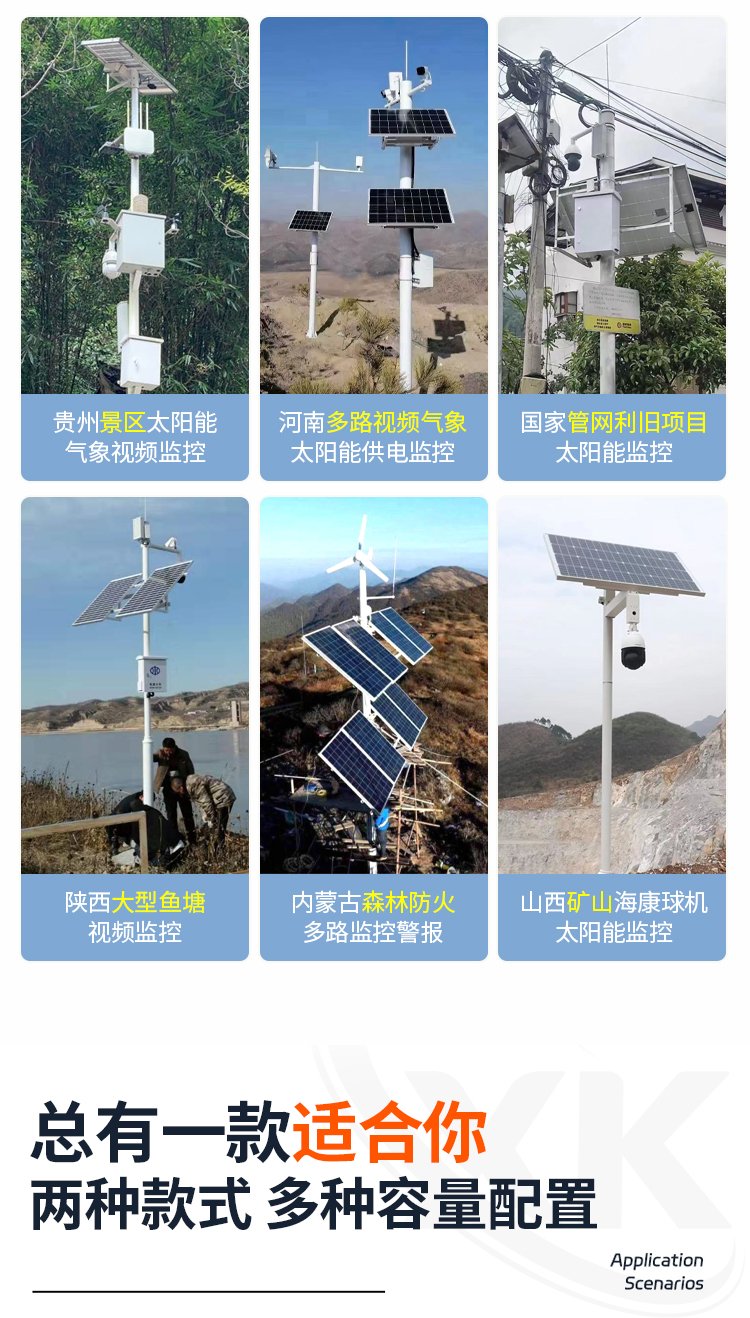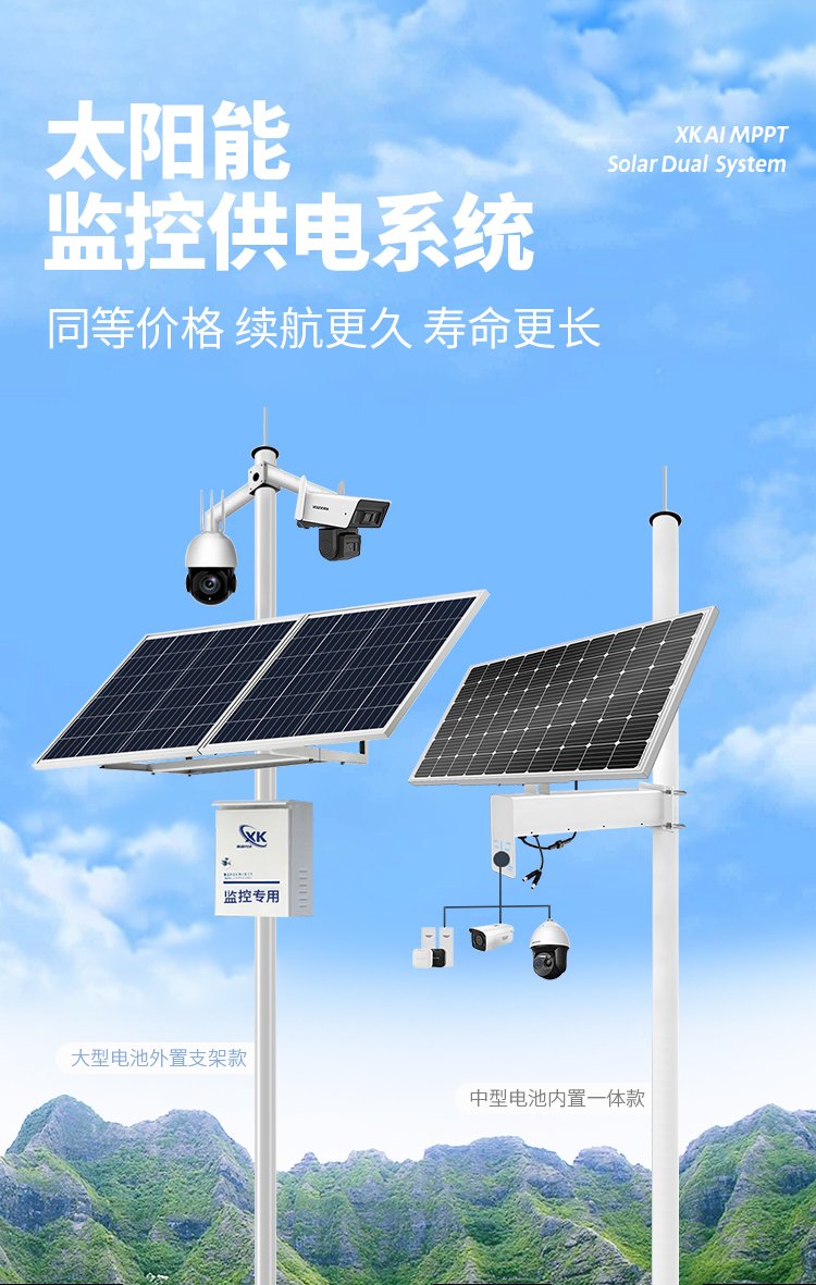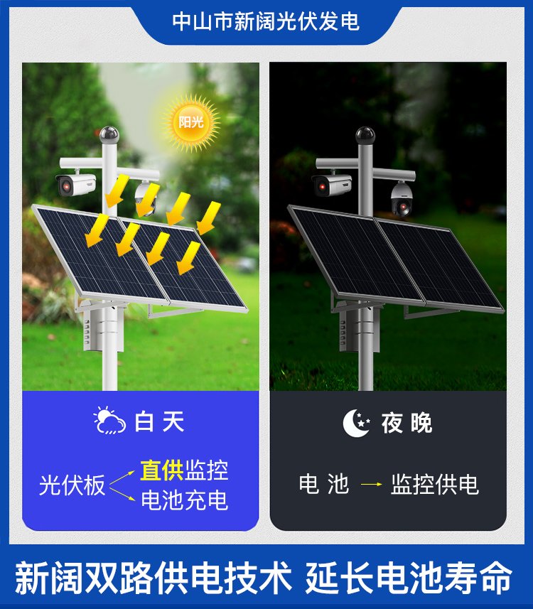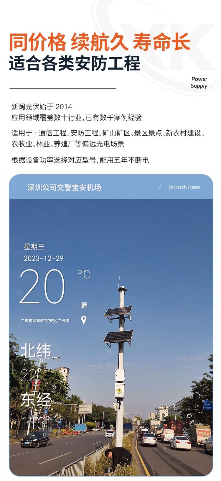 新阔12V太阳能监控供电系统,智能双路供电,白天太阳能板直接给监控供电,多余电量存入电池,减少电池放电次数,延长电池寿命。5V、12V、24V、48V皆可定制。稳定大电流供电,电流至高达到5A,能给中大型设备稳定供电,解决供电不稳定,设备无法全功率工作的问题。