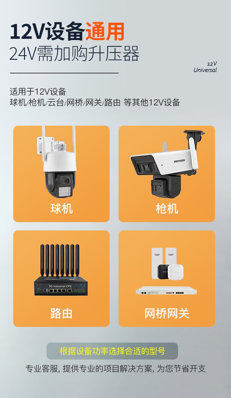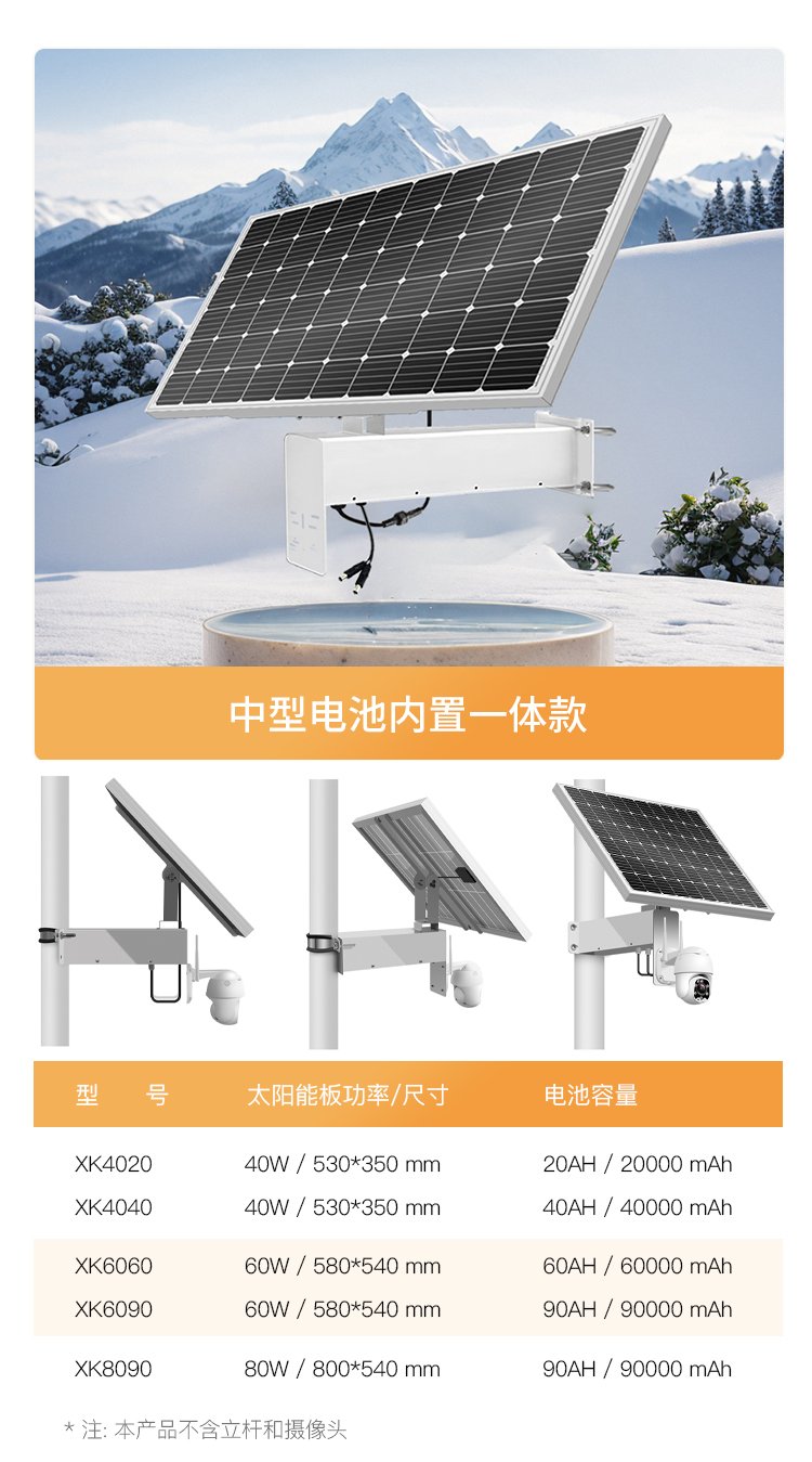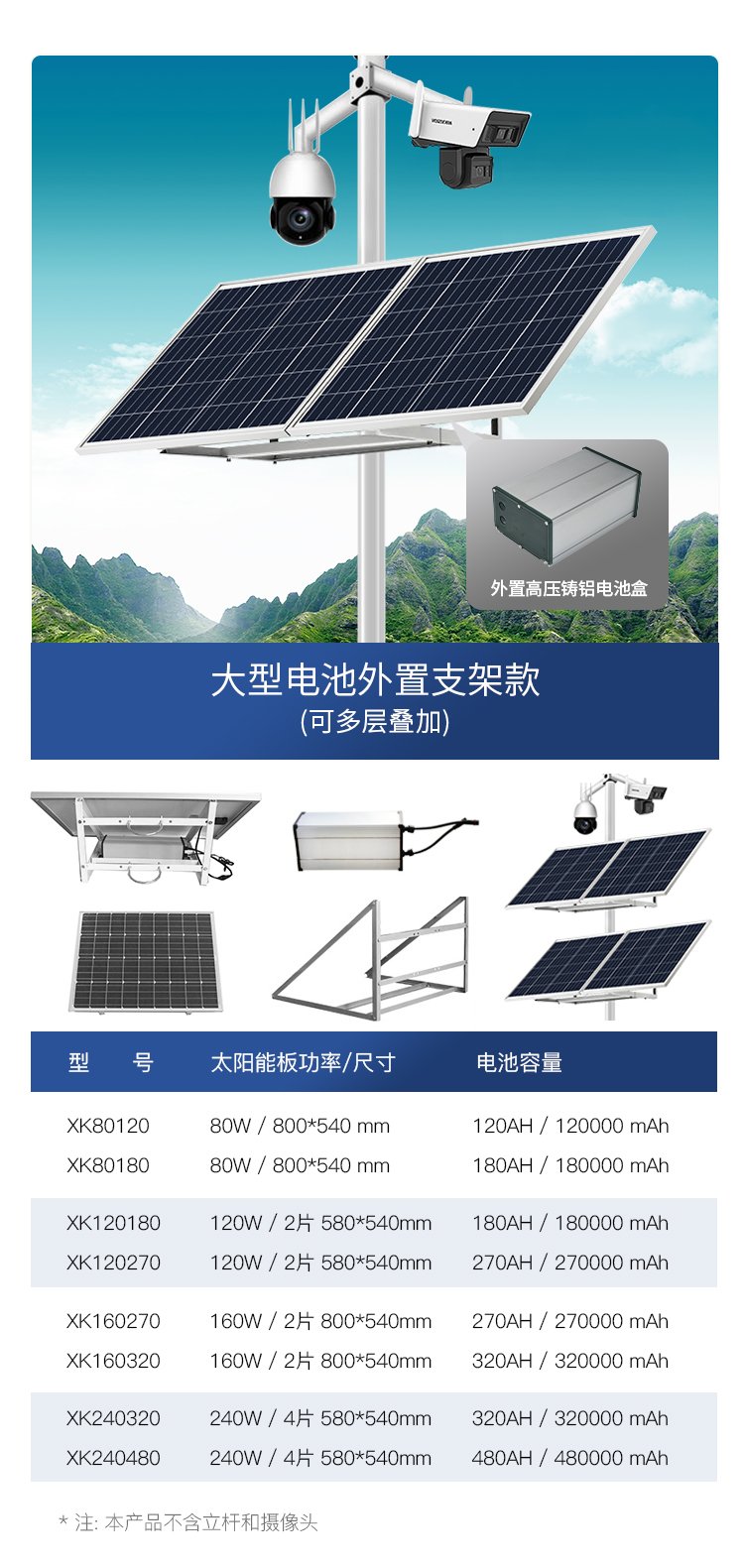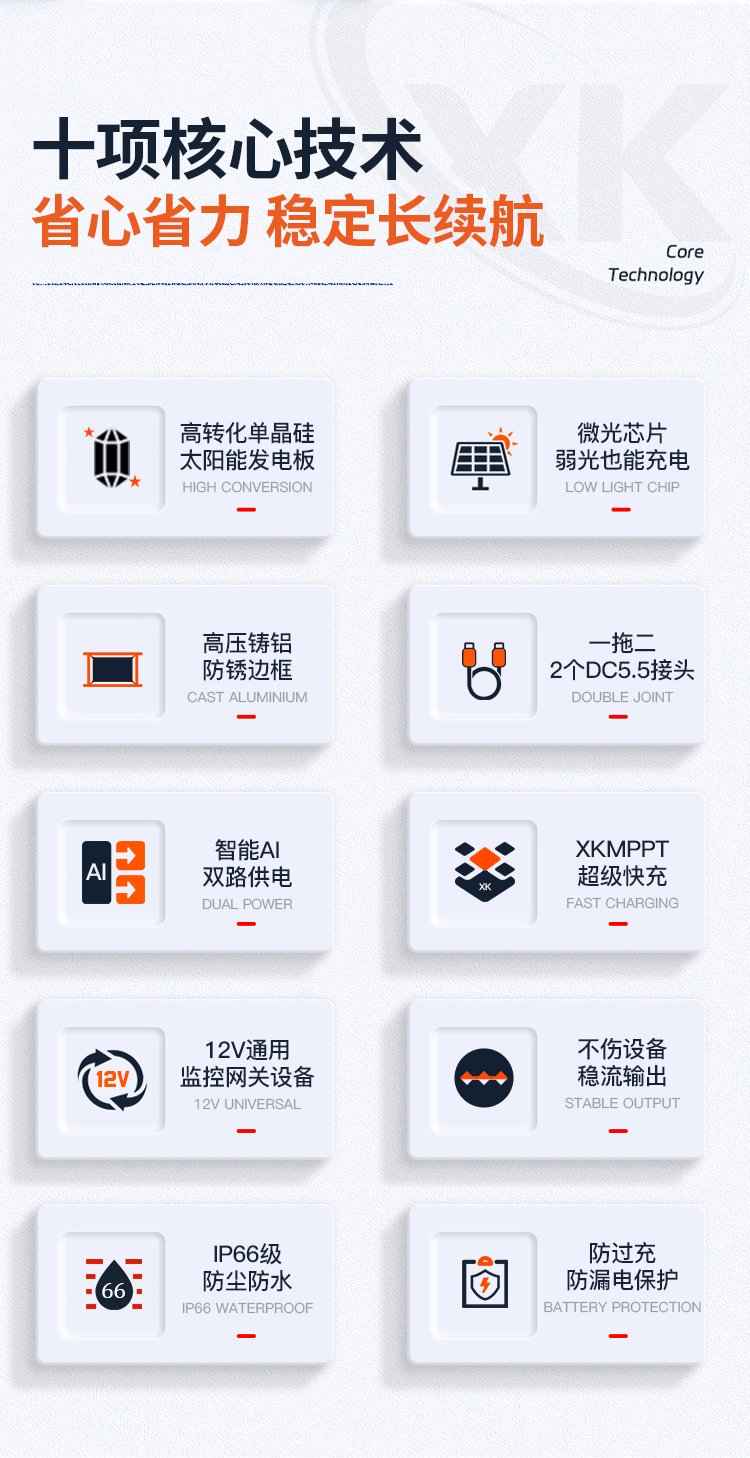 新阔12V太阳能监控供电系统,智能双路供电,白天太阳能板直接给监控供电,多余电量存入电池,减少电池放电次数,延长电池寿命。5V、12V、24V、48V皆可定制。稳定大电流供电,电流至高达到5A,能给中大型设备稳定供电,解决供电不稳定,设备无法全功率工作的问题。